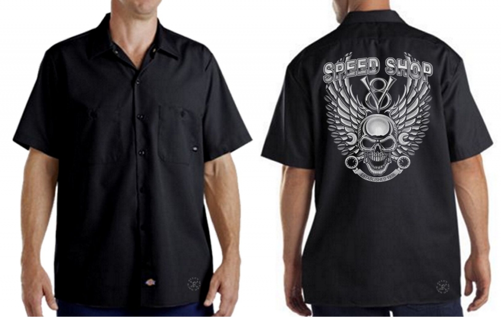 Get your Speed Shop Skull Work Shirt available in short or long sleeves!