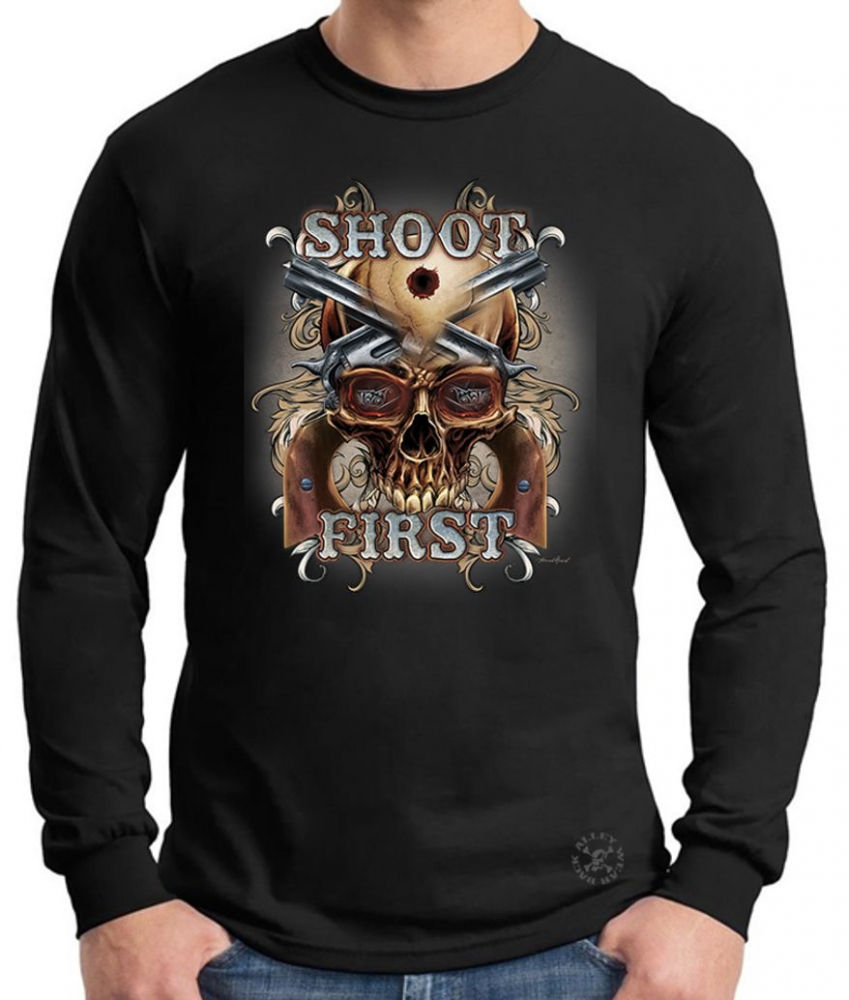 Shoot First Skull T-Shirt available in short or long sleeves and in over 25 different colors.